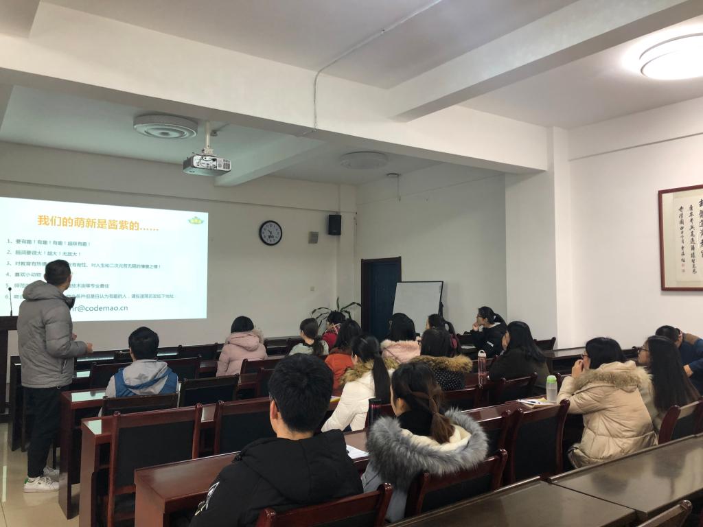 宣讲会上,大家一同观看了深圳点猫科技有限公司简介短片。随后,公司代表夏立博士从steam教育理念,社会发展趋势,公司历程和发展目标、团队建设、现有业务、未来发展、入职要求等几个方面对公司情况进行了介绍。公司主打少儿编程在线教育品牌,项目名称为“编程猫”。“编程猫”是一个少儿在线编程教育平台,产品主要面对6-16岁学生。以孩子喜欢的形式,结合图形化编程模块开始,逐步推进到专业的Python和C编程,并将游戏和故事贯穿整个教学体系,让编程简单得就像搭积木。编程猫欢迎有学科背景,并且有爱心、认真负责、愿意投身教育的同学们的加入。编程猫的公司理念和岗位要求和财神捕鱼