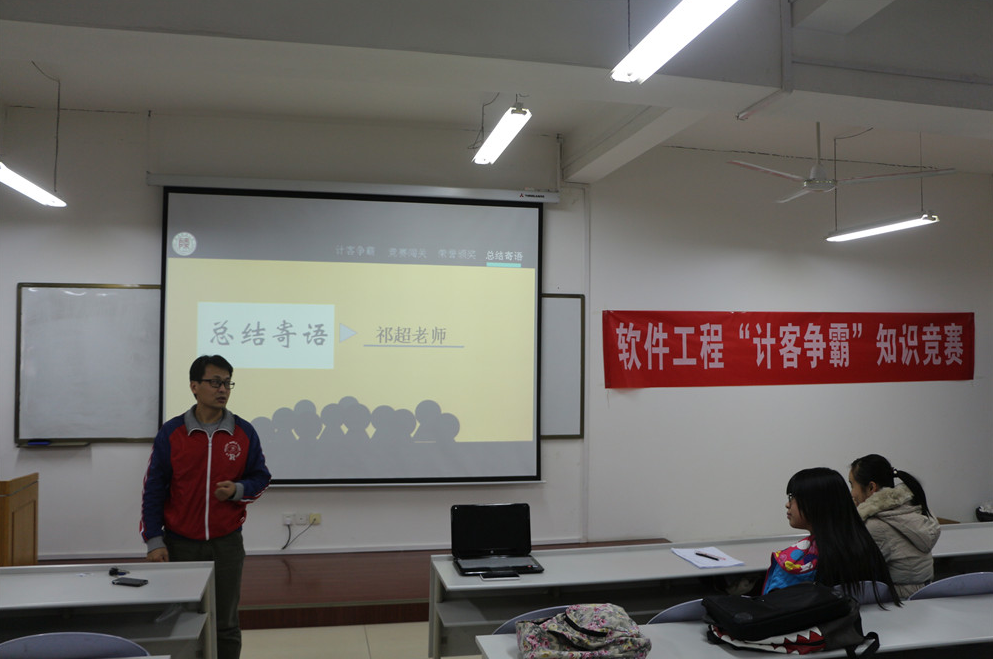 软件工程专业咨询教授张莉、软件工程专业团队负责人祁超,党委副书记袁冰、团委书记胡雯洁、辅导员郭康凌出席了本次竞赛活动,2014级全体软件工程专业学生参加竞赛。知识竞赛由班委任仰、吕昊岩同学主持。