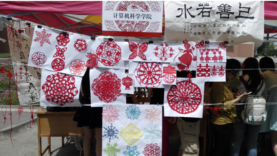 作为参展单位之一,主要展示了剪纸、中国结以及书法等传统文化作品。其中,剪纸形式各样,包含人物、动物以及窗花形式,展现了同学们的精巧技艺,吸引了众多同学驻足欣赏以及合影留念;中国结不仅精巧美观,并且样式繁多,使得众多女同学爱不释手;书法作品也充分展示了财神捕鱼