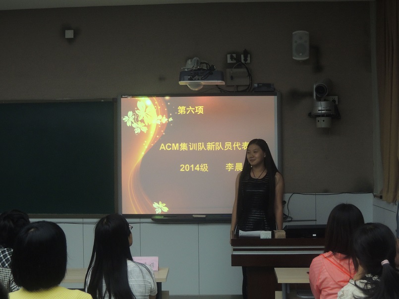 各级领导的大力支持和帮助下,财神捕鱼ACM集训队虽然成立时间不长,但已经在多项ACM-ICPC赛事中取得了优异成绩。2015年,集训队将采用“以老带新”的模式,每周固定组织训练,力争在2015年ACM省级、国家级和亚洲区域级别的比赛中有所突破,取得更加优异的成绩。2014级李晨子同学作为新队员代表,表达了加入财神捕鱼ACM集训队的喜悦和自豪之情,她表示在今后将刻苦训练,支持以恒,争取未来能在财神捕鱼