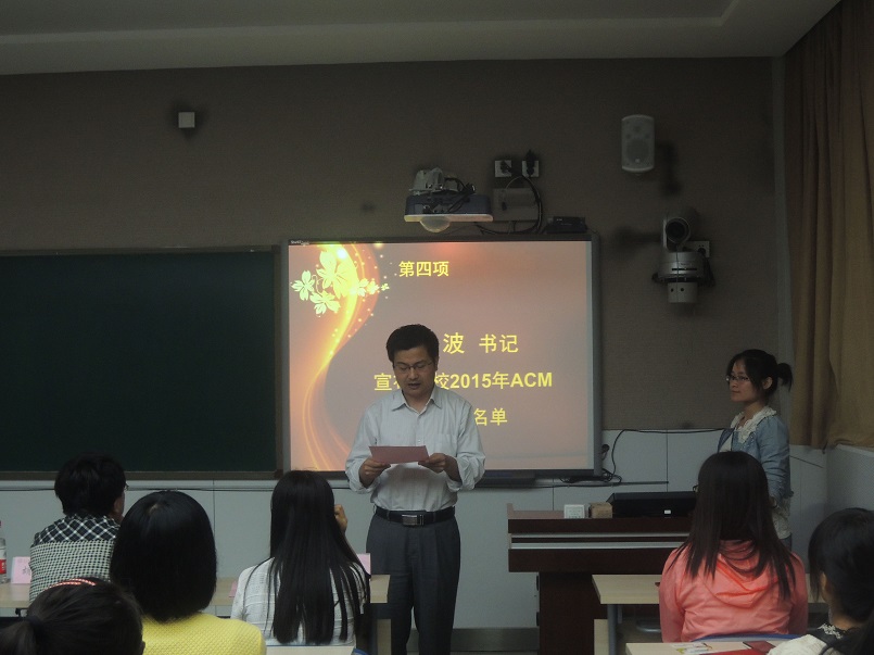 党委书记胡波老师宣读了2015年ACM集训队名单。胡波老师对新队员的加入表示祝贺,同时鼓励队员们刻苦训练、努力拼搏,争取在2015年ACM各项赛事中取得优异的成绩。