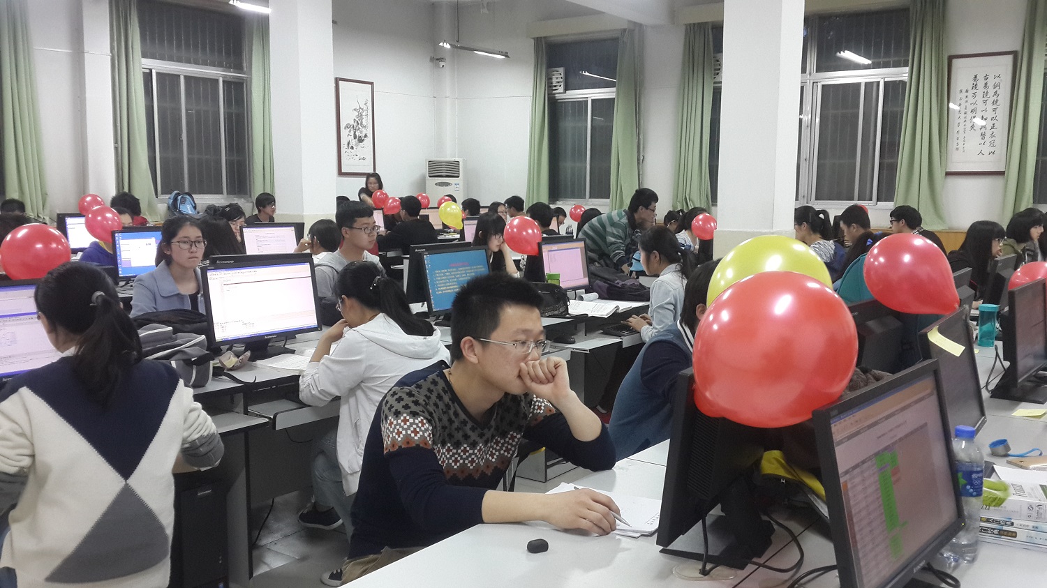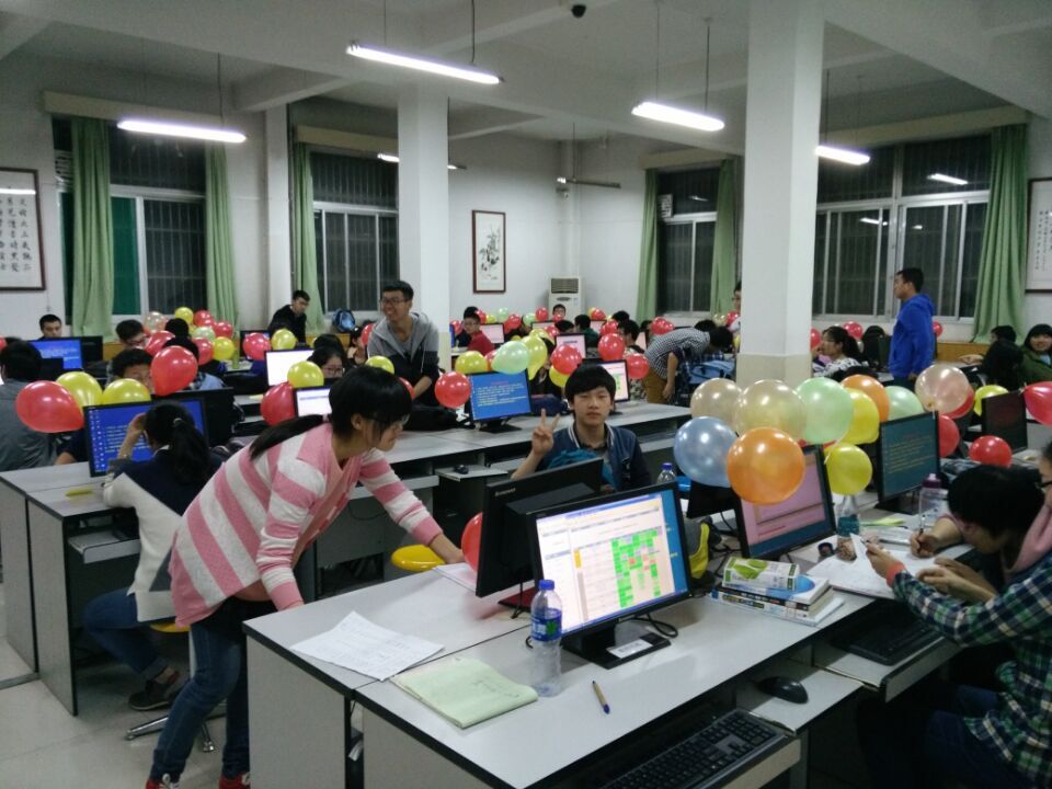 随着马苗老师宣布“比赛正式开始”的口令,参赛选手进入了紧张的比赛中。本次竞赛模拟亚洲区域现场赛模式,竞赛采取的梯度命题形式,每道题对应不同颜色的气球,参赛同学每做出一道题,志愿者给相应同学递上相应颜色的气球。比赛期间,同学们专心致志的看题思考,聚精会神的编写程序,五颜六色的气球一个一个的升了起来,键盘的敲击声急促的在教室里回荡。经过三个小时的紧张赛程,本届大赛圆满落下帷幕。基于同学们积极热情的参与度和平时努力的学习,选手们表现优异,最终决出一等奖1名、二等奖2名、三等奖8名、顽强拼搏将14名。