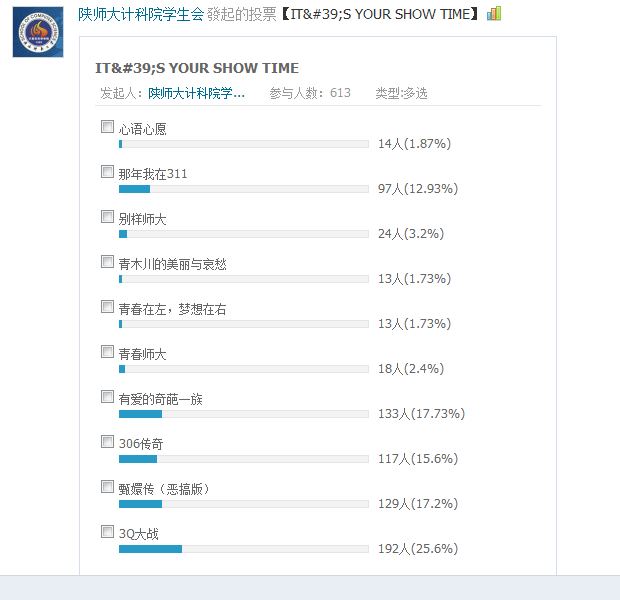 院学生会官方微博也向全院学生发起了为期一天的大众投票,全院近300人参与了本次投票,研究生也用实力证明了一切,位居榜首。