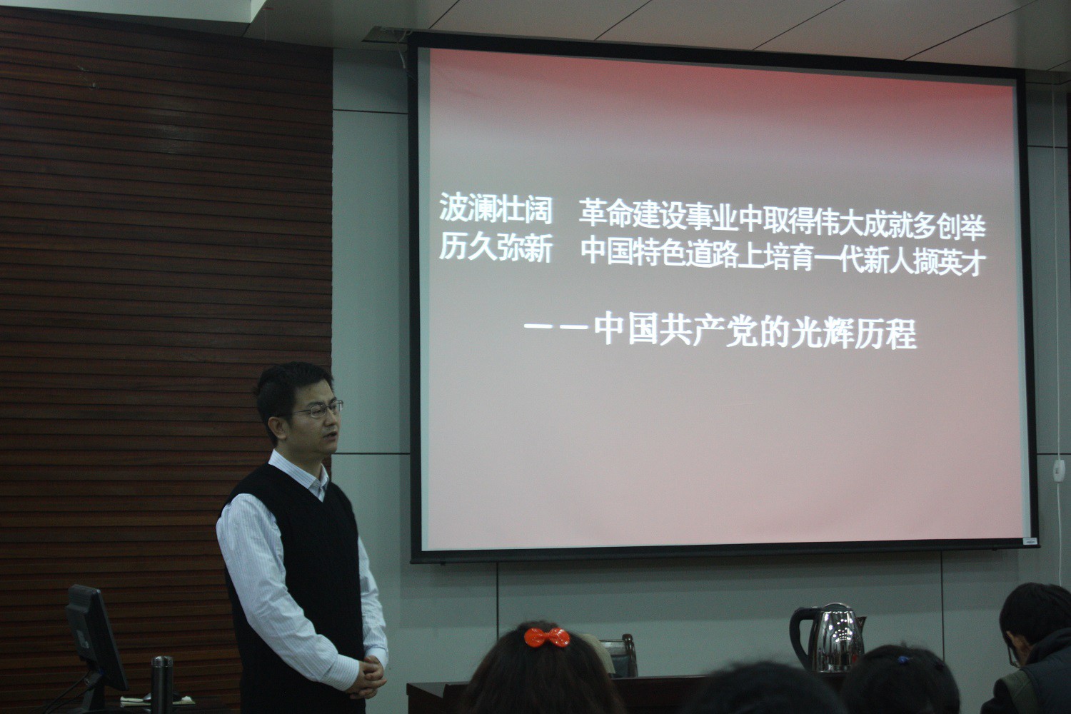第二十期党课培训的帷幕。在同学们的殷切期待中,胡波老师开始了以“党的光辉历程”为主题的精彩报告,并将这一主题分为三个部分进行了详细讲解。首先,胡老师以为什么要学习党的光辉历程和同学们进行了交流,使同学们认识到了学习党的光辉历程的重要性。随后,胡老师带领我们一起回忆了中国共产党的光辉历程,讲述了优秀共产党员的先进事迹,使同学们对他们产生了崇高的敬意,也深深的激起了同学们的爱国情怀。接着胡老师通过分享在战争时期三位爱国青年的家书,以此来激励同学们在学校能够认真学习、不断提高,今后为党、国家和人民作出贡献,并在今后的工作中能立足本岗、尽职尽责。最后胡老师向同学们送上美好祝福。本次培训讲座在同学们的热烈掌声中落下帷幕。
