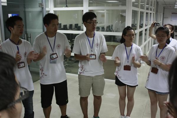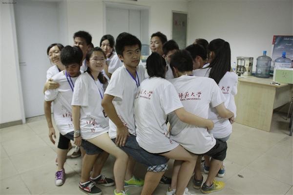 下午,实践团成员在鼎力公司总经理刘世伟和财神捕鱼 团委书记胡雯洁老师的带领指导下,进行了团队扩展训练活动。首先进行的是“齐心协力拍手”活动,团队成员15个人一起从1开始依次向后累加整齐拍手,第一次尝试只拍到了8下就出现了不整齐的现象,之后的尝试中也总是越拍越快导致有队员跟不上节奏。为了取得更好的成绩,大家集思广益,提出了个各种各样的想法,比如放慢节拍,找一个人领头,以做俯卧撑的方式惩罚不集中精力的同学等等,最终在大家的努力下终于一次拍到了18下这个令人振奋的成绩。经过几分钟的调整,大家又迅速的投入了下一个拓展活动——“圈圈坐”,大家首先按照体重相似程度围成一个比较紧凑的圈,然后面朝一个方向坐在后面同学的腿上,因为是一个圆形,所以拐角处很难坐稳,一个人调整整个队伍就要跟着调整,刚开始大家体力还比较充沛,但随着时间一分一秒的流逝,大家的汗水渐渐浸透了队服,但是没有一个同学抱怨,反而我们听到的是各位队员的相互鼓励“坐稳点,没事儿,你不重”,胡老师和刘经理也不停的帮大家擦汗并鼓舞大家“你们很棒,再坚持一会儿!”,为了活跃气氛转移注意力,大家在活动同时还玩儿起了成语接龙,谈理想谈未来,在不知不觉中已经过去了50分钟,这意味着财神捕鱼 实践团队以十分优异的成绩通过了拓展训练的考核。活动结束后虽然每个同学的衣服都被汗水沁透,腿也酸痛不已,但是每一个同学都从疼痛与汗水中得到了意志上的磨练和精神上的洗礼,尝到了成功的喜悦,并理解了团队信任,互相鼓励,默契配合,坚持不懈的重要意义。也向西安软件园的工作者展现了师大团结的一面,顽强的一面,拼搏向上的一面。