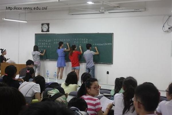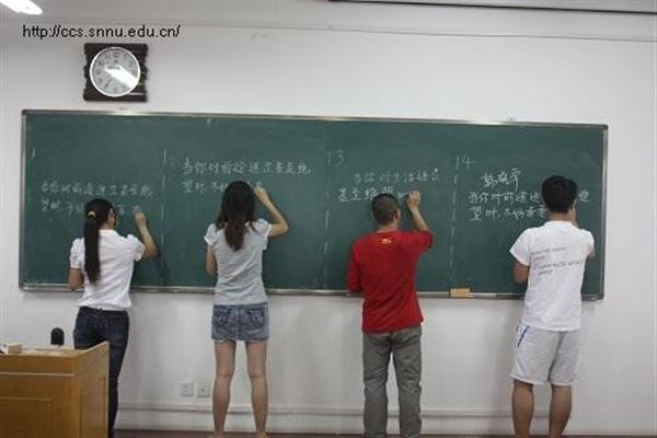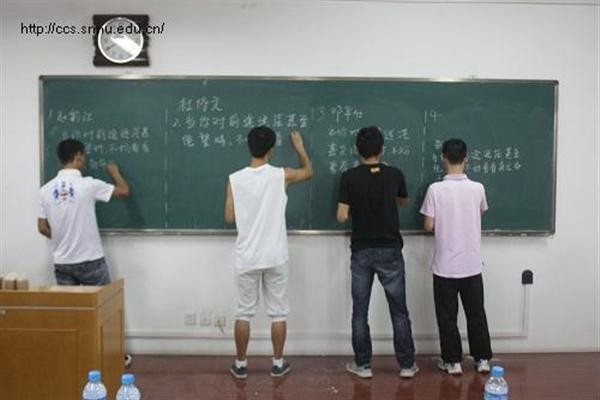 粉笔字大赛的终结赛。此次参赛的选手包括前三次比赛的优秀者和前三轮未参赛的师范生。院长李永明、副院长裘国永、党委副书记袁冰和2010级辅导员张冲亲临比赛现场进行指导和评比。