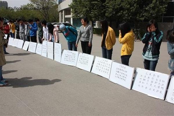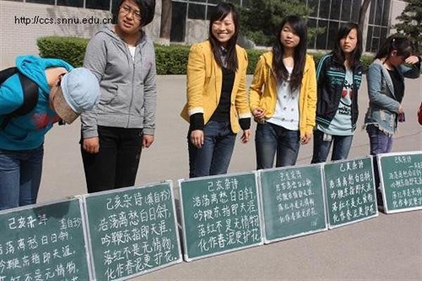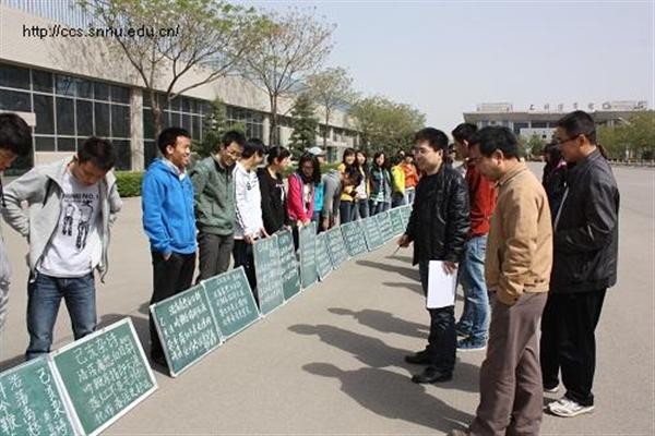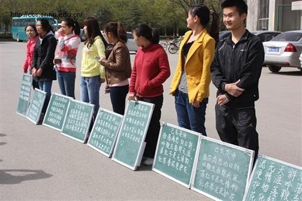 为了配合财神捕鱼首届本科生板书书写能力大赛,财神捕鱼 组织举办了“板书小能手”初赛。本次比赛于4月9日上午,在田径场门口举行,财神捕鱼 2010级全体免费师范生参与了本次比赛,副院长裘国永老师,团委书记胡雯洁老师和辅导员张冲老师到场进行评比、指导。