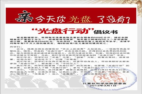 团委将在阳光苑、溢香楼餐厅发起“光盘”行动,号召全体同学从自身做起,以身作则,节约粮食,减少餐桌上的浪费,进而影响身边的每一个人。