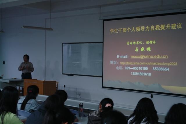 的100名学生干部做了题为《学生干部个人领导力自我提升建议》的专题讲座。马晓雄讲到做学生干部工作在于追求大学教育的附加值,社会的评价标准和学校内部的评价标准是不同的。同时讲述了学习中的误区,并形象的将学习三境界比喻为蜘蛛式、蚂蚁式与蜜蜂式学习。教同学们要学会使用“卮言”,进行开放性思维与教育反思。其实人人都具有领导潜质和潜能,只是有待于开发而已。最后,马晓雄做了关于领导力特质的测量表,以帮助同学们了解自我能力的缺失,并提出关于学生干部个人领导力提升方法的建议,便于帮助大家更好的完善自我。