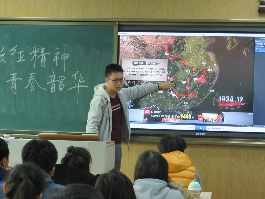 伴随着抗战年代的炮火声,张俊哲同学走上讲台,带领大家重温长征岁月,他向大家展示了长征时期中国的版图,并标示出了每一部分的主要兵力,随着地图上长征路线的不断推进,大家也似乎重走了长征路,深入体会到了长征路的艰辛。