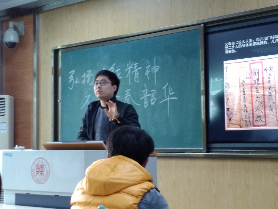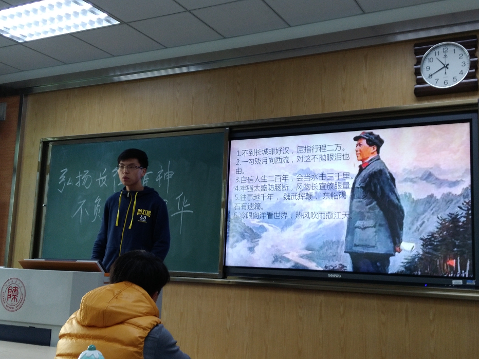 会议由张育“Mr.Zhang’s Talk Show”开始,他以毛泽东《七律·长征》为题,为大家介绍了长征的主要历程,唤醒了大家对长征岁月的思考,为班会的顺利进行做好了铺垫工作。