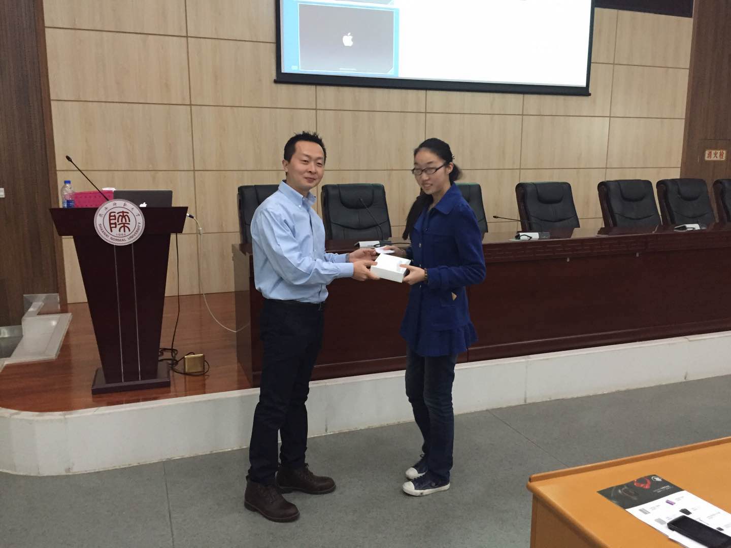 孔文达老师主要讲述了MacBook的硬件配置,主要功能以及苹果其他部分产品的与MacBook相关的功能。在宣讲会开始之时,孔文达老师和同学们分享了一句苹果现任CEO(具体名字)的话:“我们的目标是创造卓越的产品,丰富人们的生活。”使同学们对苹果公司的理念有一个大致的了解。在之后的宣讲中,孔文达老师通过视频,实例以及自己在生活中应用苹果产品的感想,形象生动的将同学们带进了一场让人眼花缭乱,目不暇接的科技盛宴。孔文达老师详细给同学们讲解了苹果公司自己的开发语言swift,苹果公司一年一度的盛会WWDC,苹果的安全系统和优雅直观的界面以及苹果MacBook的各种手势。在宣讲会的最后阶段,进行了大家期待已久的抽奖环节。在抽奖之后,获奖者与孔文达讲师合影留念。