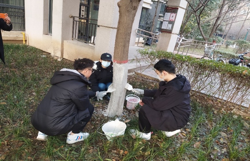 八点二十,同学们早早地聚集在家属院一期门口,后勤服务中心的工作人员为大家说明了活动范围和注意事项,同学们配合工作人员完成石灰水涂料的调制,并领取手套、刷白漆的小桶和刷子,随后分组开展活动。