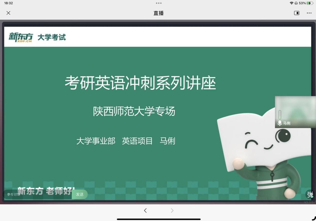 于2022年11月23日晚组织召开线上考研英语作文冲刺分享会。新东方资深考研英语讲师马俐老师应邀分享,会议由2019级辅导员刘柱主持,2023届全体考研同学参会。