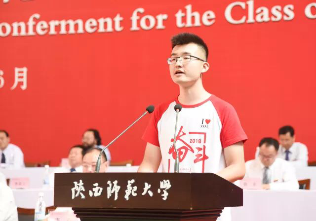 2014级公费师范生李天宇。四年前,我们手持散发浓浓墨香的通知书,满怀憧憬地走进师大;四年来,我们无时无刻不感受着十三朝古都的厚重,体味着师大雁塔校区的古朴典雅、钟灵毓秀,长安校区的现代开放、气势恢宏。今天,我们即将带着“厚德、积学、励志、敦行”的校训精神离开母校,我们无悔自己当初的选择,更要感谢自己四年来的奋斗。