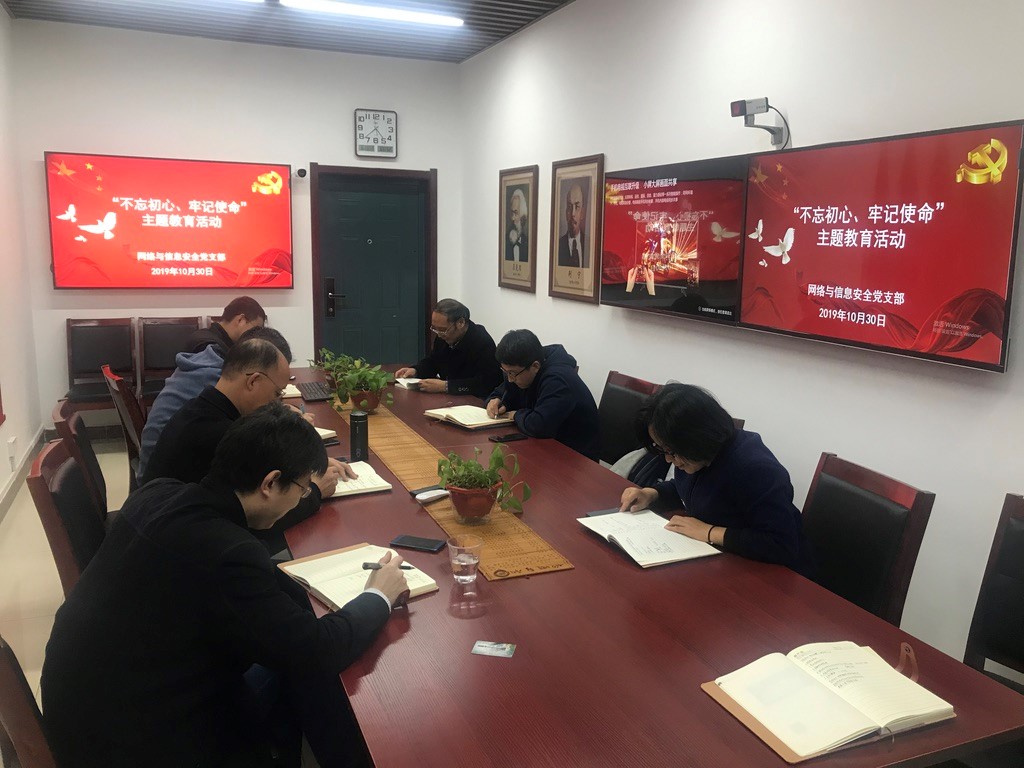 网络与信息安全党支部在文津楼3531党员活动室开展了“不忘初心、牢记使命”主题教育学习会议。在校全体党员参加了本次活动,支部书记禹勇老师主持学习活动并为支部党员讲授党课。
